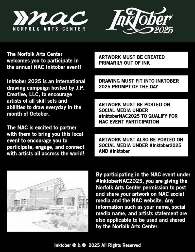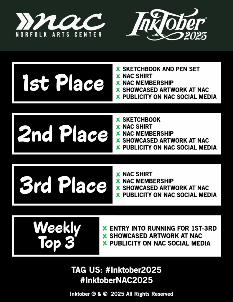 Don’t forget to tag the Norfolk Arts Center with #InktoberNAC2025 to enter the contest!