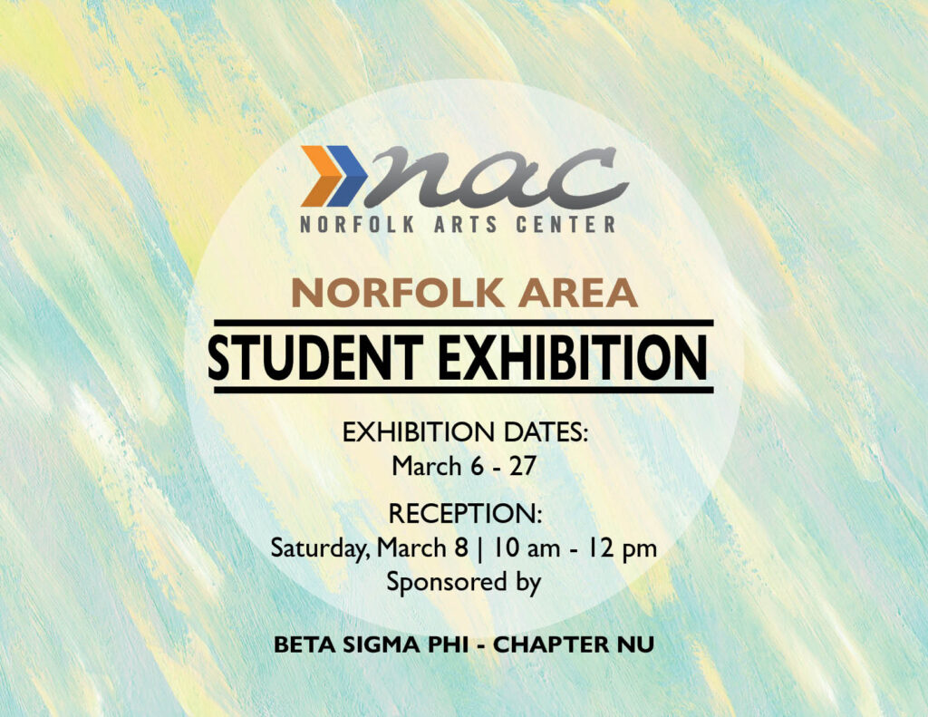 Artwork created by students from the Norfolk area will adorn the walls of the Gallery and Atrium, as we host the annual Norfolk Area Student Exhibition. Public and parochial instructors gather artwork throughout the school year and then come together to create this amazing collection of student art. Elementary middle and high school students are represented and all skill levels are on display. New for this year will be a half gallery black lit exhibit. Specially created artwork will come to life in the dark of the half gallery. Join us to see this unique display beginning March 4 with the student artist opening reception. From 10 am – 12 pm drinks and refreshments will be served by Alpha Nu a chapter of Beta Sigma Phi