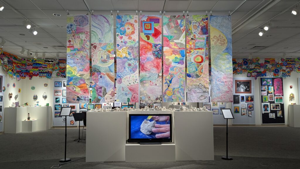 A special highlight of this year’s exhibition is the collaborative work created under the guidance of artist Kim Darling. Spending a week with students, Darling led workshops in clay and painting, encouraging them to explore new techniques and express their unique artistic voices. These student-crafted projects are prominently displayed in the center of the main gallery, serving as a testament to the power of hands-on art education.