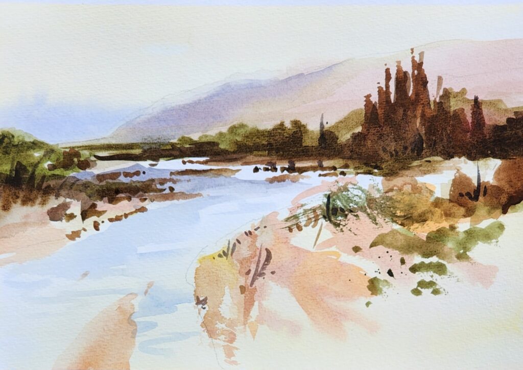 He uses a limited palette, valuing simplicity and restful space. In his view, “watercolor is magical, an exotic medium with no boundaries.” Telagio’s images vary from entirely realistic to somewhat more impressionistic.